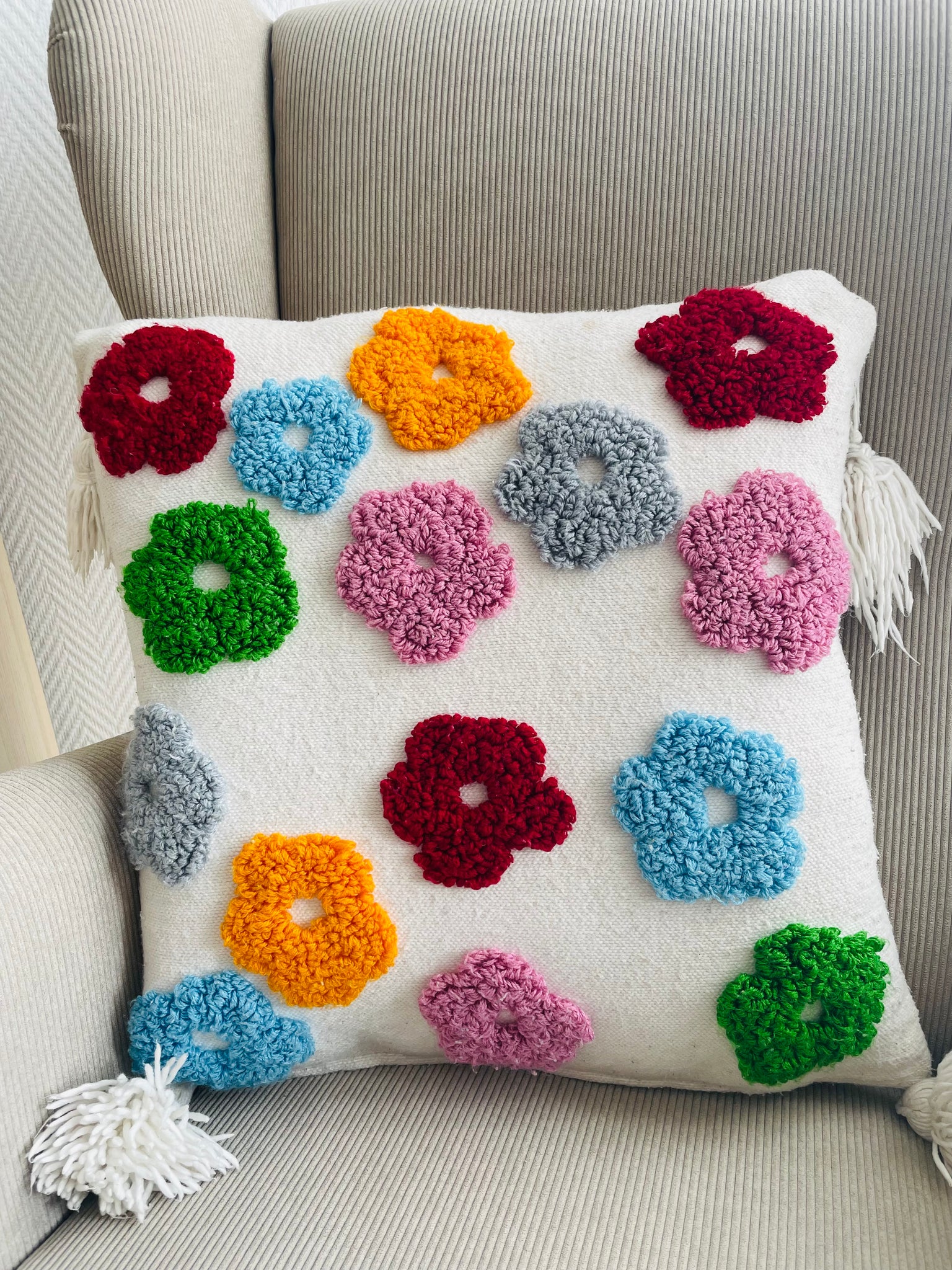 Housse en coton, broderie et pompons en laine, fermeture à zip