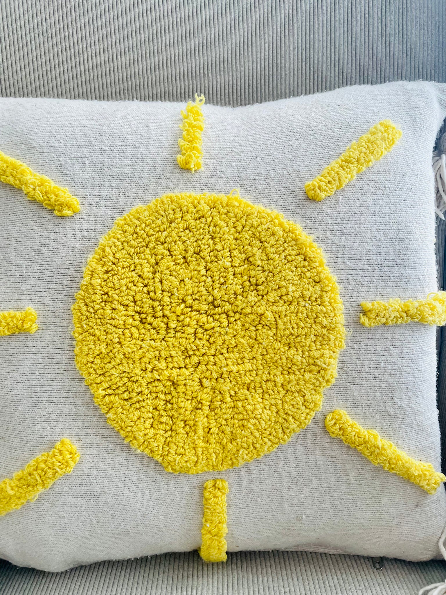 Housse en coton, broderie et pompons en laine, fermeture à zip